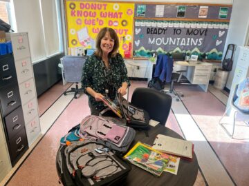 Bucks IU School Social Worker Marci Cianni loads backpacks filled with school supplies for students in need at the Bucks IU at Samuel Everitt in Levittown.