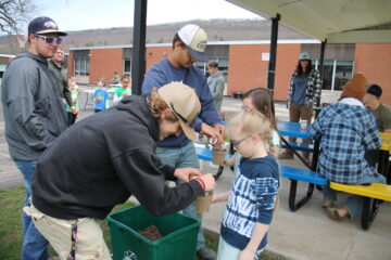 The students were involved in many different activities throughout the afternoon. Junior and senior students from the Bald Eagle Area High School helped K-5 students plant white spruce trees that were part of the Seedlings for Schools partnership program of the Pennsylvania Game Commission’s Howard Nursery and the Wildlife for Everyone Foundation. The high school students discussed the importance of trees to the environment before helping each student plant their own tree to take home. Centre Region Recycling and Refuse Authority’s Amy Schirf explained the importance of recycling by showing the different types of plastics, metals and cardboard to the students. A scavenger hunt introduced students to pollinators in the region, and objects that can be recycled. There was also an activity where students created wildflower seed pods to take home and plant.