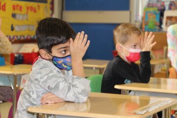 Kindergarten class learning “shark fin breathing”