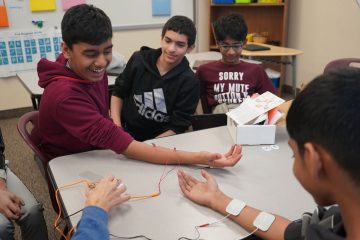 Mrs. Giles and Mrs. Fuhrman teamed up to show seventh graders at J.S, Wilson Middle School how the nervous system works. Using the Backyard Brains Human-to-Human Interface, one student controlled another student’s arm using just their muscle signals. When one student flexes, this device picks up electrical signals in their muscles and sends them to a partner — making their partner’s hand move! This safe and interesting lesson helped students better understand how the brain sends its unique messages through the nerves and into muscles.