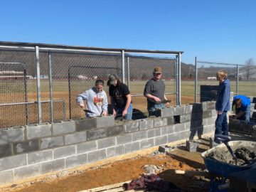 “The job consisted of laying approximately 750 eight-inch concrete blocks to build the two dugouts. Each dugout has an attached storage building. The Masonry students who worked on the project are in grades 10 through 12. The students mixed the mortar, laid the block and installed anchor bolts in the top course and were responsible for building, working from, and disassembling scaffolding. The project took five days from start to finish and was completed on March 30.