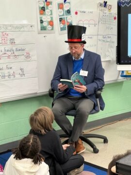 Superintendent Scott Eveslage reads chapter one of “A Boy Called Bat” by Elana K. Arnold to students.