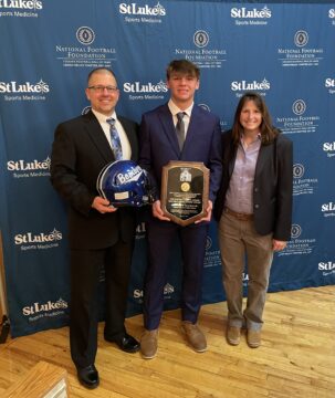 Chris Walkowiak (football coach), Matthew Machalik, and Paula Husar (HS principal) pose at this year’s award ceremony.