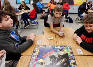 Students in Mrs. Kristi Sines’ seventh grade Geography class enjoyed a unique method of learning for their unit on Eurasia and World War II. Thanks to the generosity of a grant through the Somerset County Chapter of PASR (Pennsylvania Association of School Retirees), Sines was able to purchase World War II Monopoly games. These games, similar to the iconic original, provide students with a unique method of learning about Pearl Harbor, D-Day and other key battles of this war. Due to pandemic restrictions after purchase, Sines was unable to incorporate the games into her curriculum until this school year. Students, including Emma Hobbs, Morgan Stair and Chloee Knudsen, enjoyed the games and the experience reinforced the material they have been studying.