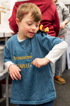 Nathan Miller shows off the insect he made after learning how to identify insects on the Mobile Ag Lab.