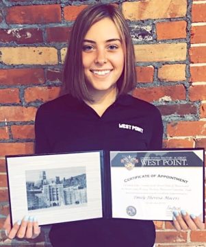 Emily Maceri holds up her “Certificate of Appointment” to the United States Military Academy.