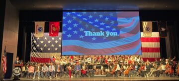 Flanked by a huge American flag in the theater, the TJHS band, orchestra and choir performed several patriotic songs, including a rousing Armed Forces Salute compilation with accompanying video to end the program.