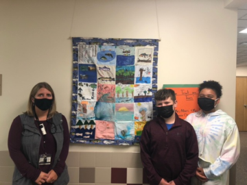 Trout Are Made of Trees, by April Pulley Sayre, and then talked about how everything in an environment is important, no matter how small it may seem. The students also discussed how everything in an environment is connected, even if at first it doesn’t seem like it is. After reading the book, the students had to choose a part of the book that they could recreate on a quilt square. Twenty-five squares were then sent to other participating schools that were located as far away as Alaska, Colorado and Utah. Accompanying the quilt squares was a letter describing their experience raising the trout in the classroom. Students had to describe the watershed that the fish were released into as well. When the school received all of the squares, they shared letters with the classes and created a quilt of the received squares from other schools. With all the squares sent to CAIS, Mrs. Albers’ mom, who loves to make quilts, assembled them for both classes. This was a great experience that connected many areas of the curriculum such as geography, science and ELA.
