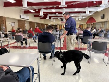 With a slow rollout of allowing more guests to the school since the pandemic previously restricted it, Sandoval was able to come in and work with students firsthand helping teach them more about how dogs and handlers are trained, the work they do, the potential of different careers and more. Sandoval was formally part of the K-9 unit in the Army and now works in the private sector, and calls Porter not only a colleague, but member of his family as the dog also lives with him. “When the vest is off, he’s just another dorky dog who won’t listen to me,” Sandoval said with a laugh, adding that the vest Porter wears identifies him as a working dog. “When the vest is on, it’s back to business.”